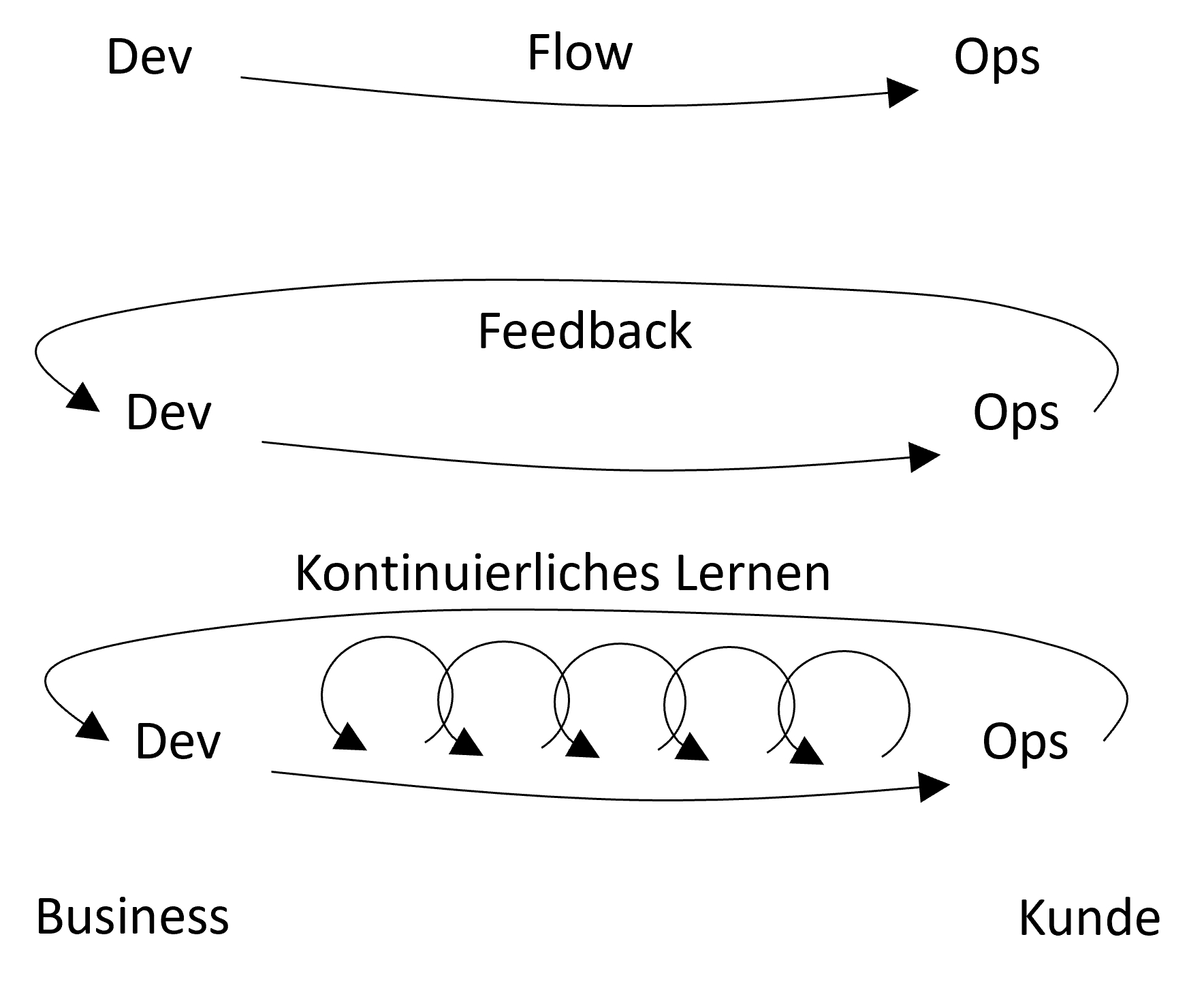 Drei Wege als grundlegende Prinzipien fĂĽr Verhaltensweisen und Muster in DevOps [9].