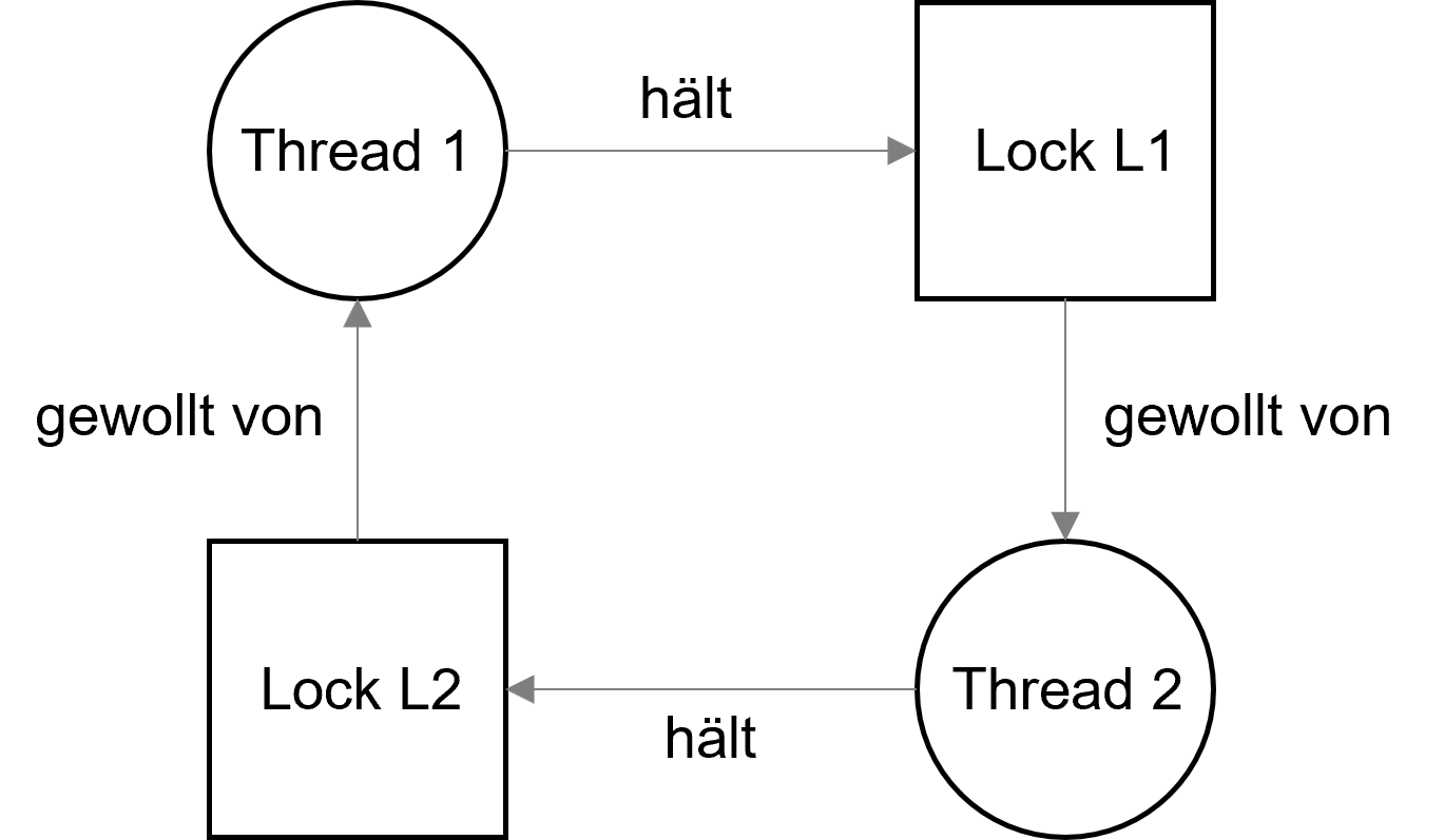 Circular Wait Es existiert eine zirkuläre Beziehung zwischen Threads, die eine oder mehrere Ressourcen blockieren, die von anderen Threads in dieser Kette angefordert werden (vgl. Grafik zuvor)